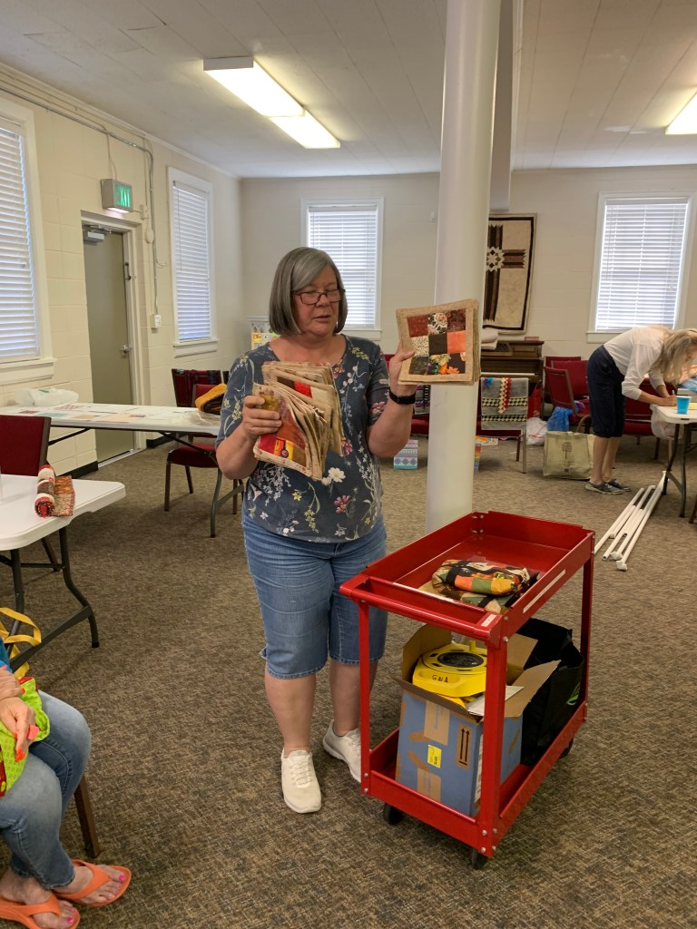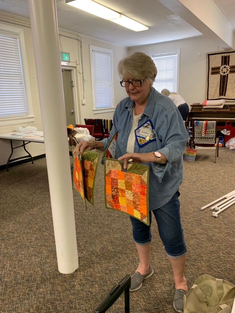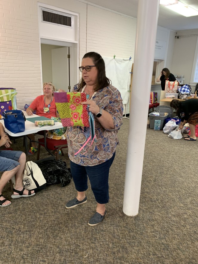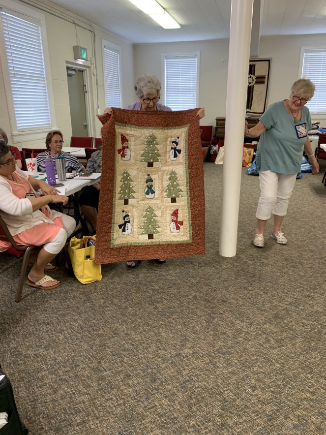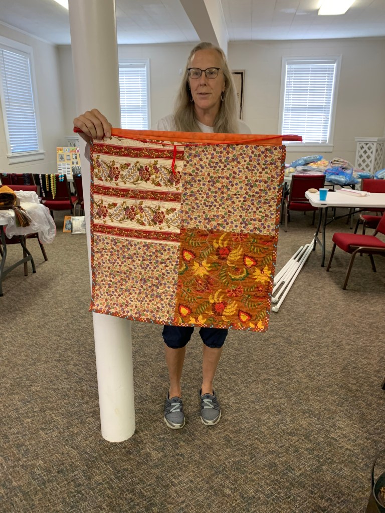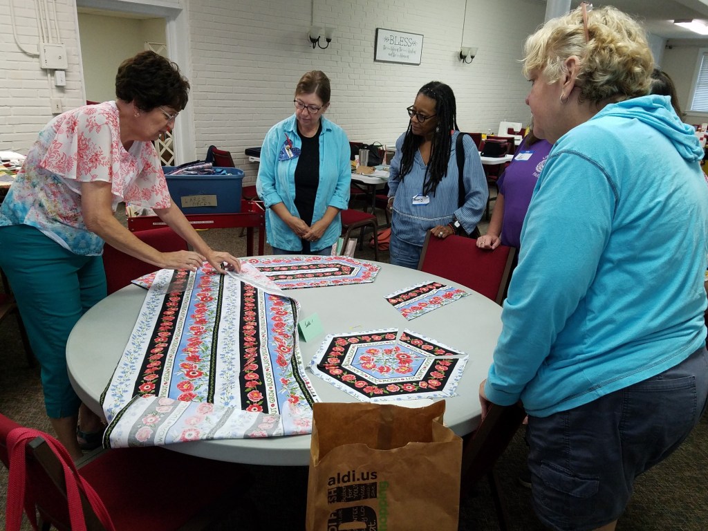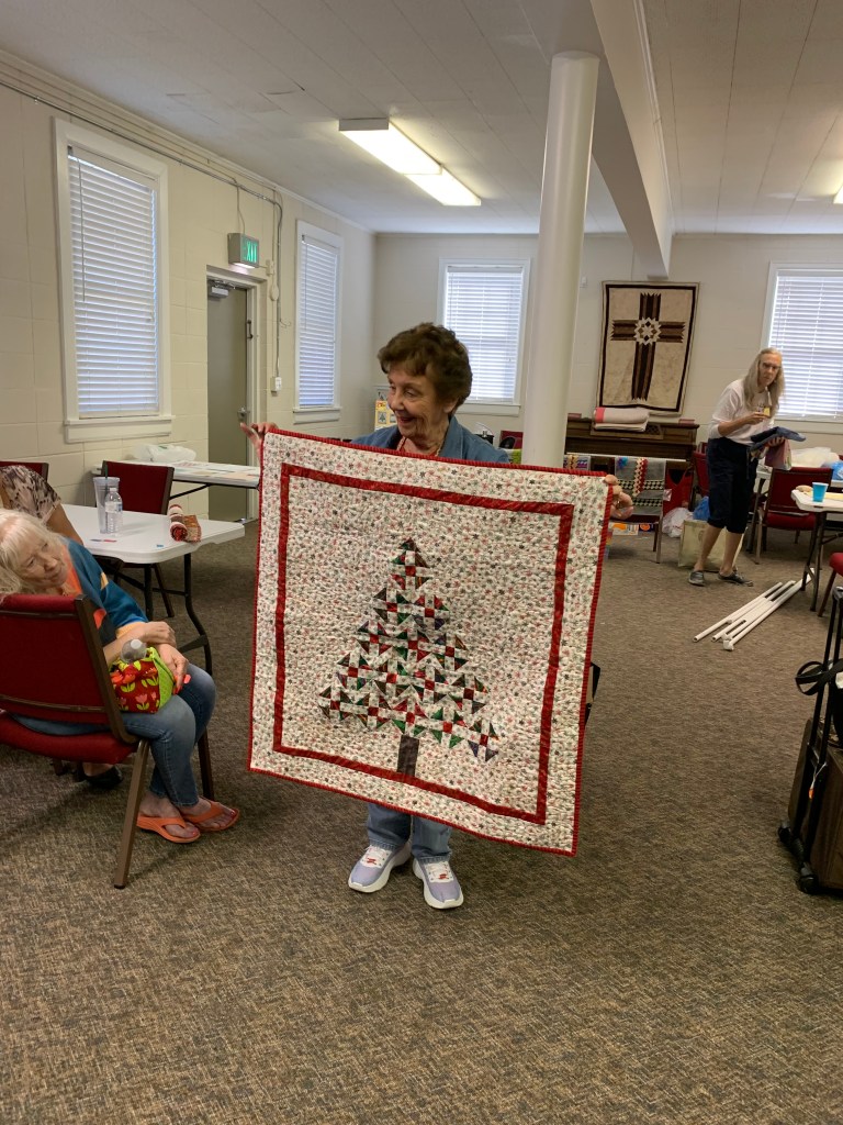The doors are open at 9AM and we appreciate folks coming then and helping set up. The morning workshop “Mini-class” on Basic Binding techniques starts promptly at 10 AM. I am preparing some small mug rugs for you to complete the binding on after I demonstrate. So far 10 people have signed up. When we finish we will join the others in our sewing morning. Please EVERYONE bring your machine and usual sewing supplies. For the class please bring some clips for the binding if you have them, and some to loan for those who don’t. Also a glue stick will come in handy, and I have also used 1/4″ fusible tape to attach the back of a binding – so bring some if you have it.. A 1/4″ foot for your machine will be best to use if you have it but not critical. The rest of you will be working on finishing stages of donation quilts, and/or making and filling one yard bags. We plan to donate to a shelter in Columbus and to the Crisis Center in Phenix City at our January meeting.
