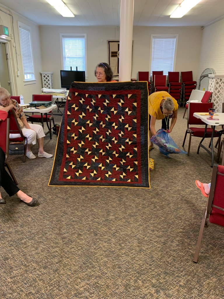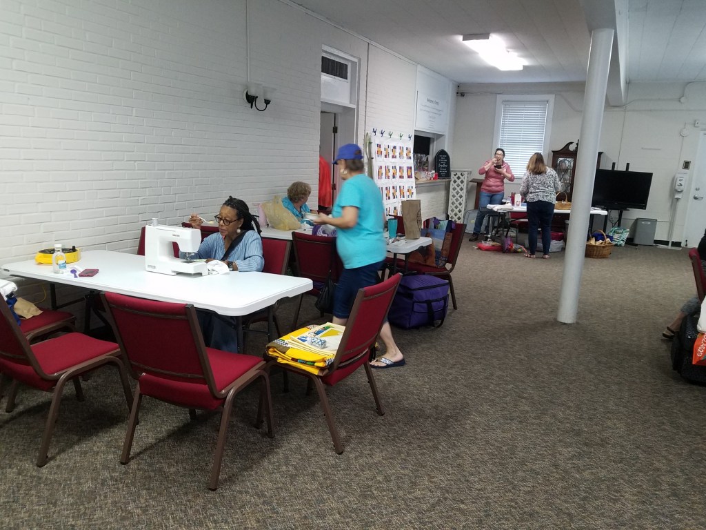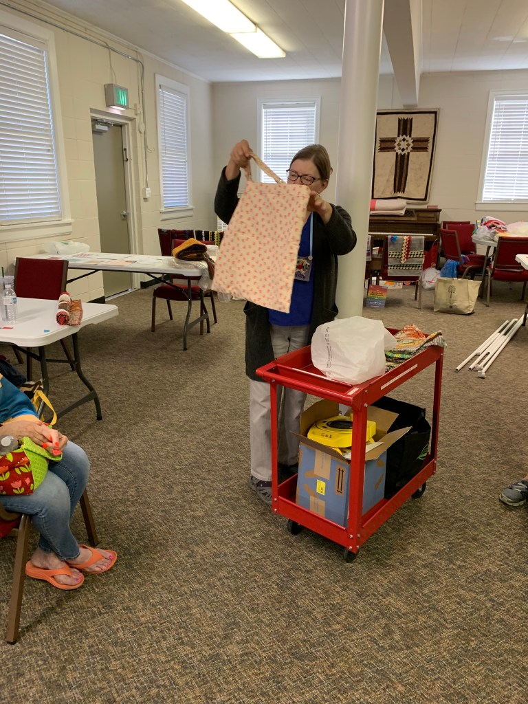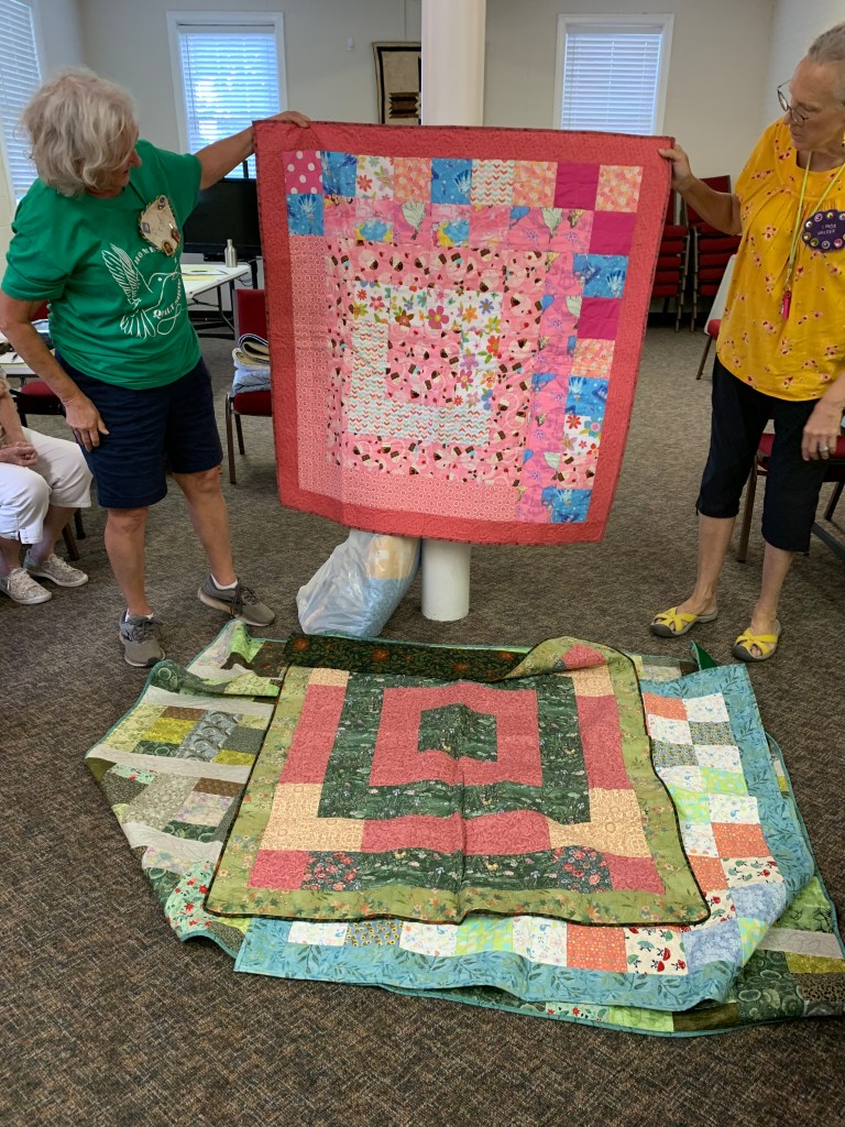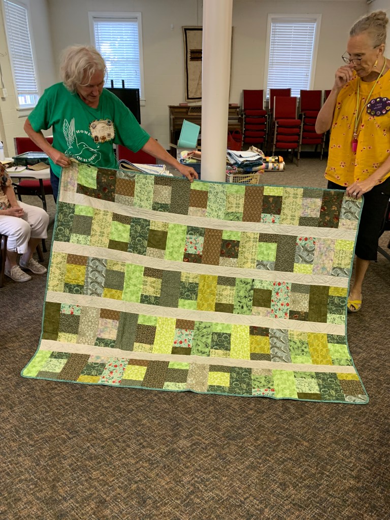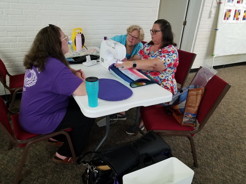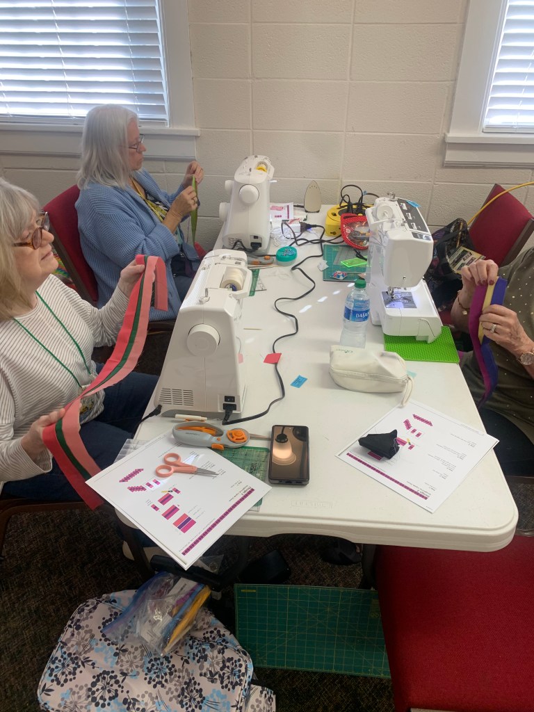 The doors are open at 9AM and we appreciate folks coming then and helping set up. The morning workshop “Mini-class” on Basic Binding techniques starts promptly at 10 AM. I am preparing some small mug rugs for you to complete the binding on after I demonstrate. So far 10 people have signed up. When we finish we will join the others in our sewing morning. Please EVERYONE bring your machine and usual sewing supplies. For the class please bring some clips for the binding if you have them, and some to loan for those who don’t. Also a glue stick will come in handy, and I have also used 1/4″ fusible tape to attach the back of a binding – so bring some if you have it.. A 1/4″ foot for your machine will be best to use if you have it but not critical. The rest of you will be working on finishing stages of donation quilts, and/or making and filling one yard bags. We plan to donate to a shelter in Columbus and to the Crisis Center in Phenix City at our January meeting.